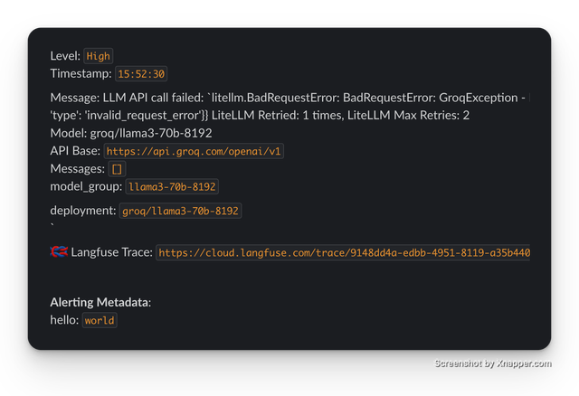 By default alerts show the messages/input passed to the LLM. If you want to redact this from slack alerting set the following setting on your config