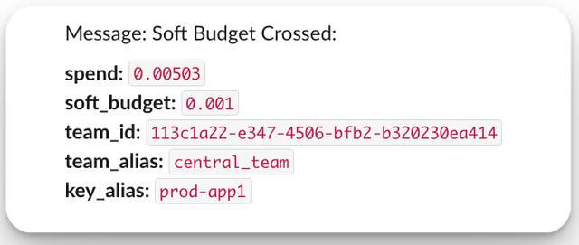 spendfloat: The current spend amount for the 'event_group'.max_budgetfloat or null: The maximum allowed budget for the 'event_group'. null if not set.tokenstr: A hashed value of the key, used for authentication or identification purposes.customer_idstr or null: The ID of the customer associated with the event (optional).internal_user_idstr or null: The ID of the internal user associated with the event (optional).team_idstr or null: The ID of the team associated with the event (optional).user_emailstr or null: The email of the internal user associated with the event (optional).key_aliasstr or null: An alias for the key associated with the event (optional).projected_exceeded_datestr or null: The date when the budget is projected to be exceeded, returned when 'soft_budget' is set for key (optional).projected_spendfloat or null: The projected spend amount, returned when 'soft_budget' is set for key (optional).eventLiteral["budget_crossed", "threshold_crossed", "projected_limit_exceeded"]: The type of event that triggered the webhook. Possible values are:- "spend_tracked": Emitted whenever spend is tracked for a customer id.